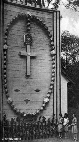 Dřevěný růženec Antona Bergera - stržen v roce 1932, výška 9 m, šířka 5 m, váha 800 kg, stál u dnes již zříceného domu č.p.42